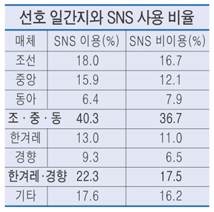 보고서에 따르면 SNS 사용자 가운데 조·중·동 선호비율은 40.3%, 한겨레·경향은 22.3%로 나타났다. SNS 비사용자에서는 조·중·동은 36.7%, 한겨레·경향은 17.5%로 나타났다. 신문을 보지 않는 비율도 SNS 사용자는 19.8%, 비사용자는 29.6%로 나타나 SNS 사용자가 종이신문 열독률이 더 높은 것으로 조사됐다.