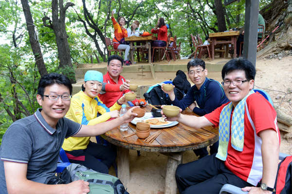 ▲ 경남신문 기자들이 등반 도중 휴게소에 들러 막걸리를 마시며 담소를 나누고 있다. (경남신문 김승권 기자 제공) |