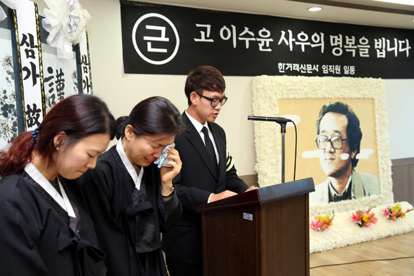한겨레신문사 부산지역 담당 이수윤(편집국 부국장대우) 기자가 지난 6일 지병으로 별세했다. 향년 55세. 이에 본보는 박찬수 한겨레 편집국장의 추도사를 싣는다.“이수윤 선배” 하고 부르면 저 영정 사진 속에서 지금이라도 뚜벅뚜벅 걸어 나와 환하게 웃을 것만 같습니다. 아직도 우리 기억 속엔 생생히 살아있는데, 이수윤 선배를 이제 고인이라고 불러야 한다는 현실을 믿을 수 없습니다. 우리는 아직 마음속에 자리 잡은 그를 보낼 수 없습니다.