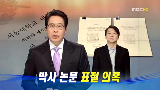 MBC ‘뉴스데스크’가 단독이라며 보도한 ‘안 후보의 박사논문 표절 의혹’ 역시 논리적인 근거가 부족하다는 게 대체적인 지적이다. MBC 외에 타 언론사의 후속보도는 없었다. 기자회는 “담당 기자는 안 후보측 반론 취재를 오후 6시30분에야 시작했고 8시45분경 전달 받은 입장을 반영하지 않아 사실상 반론권을 박탈했다”고 지적했다.