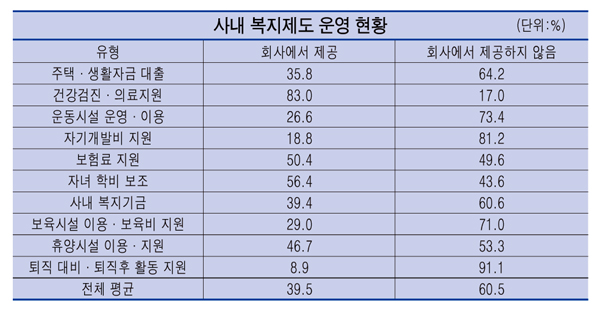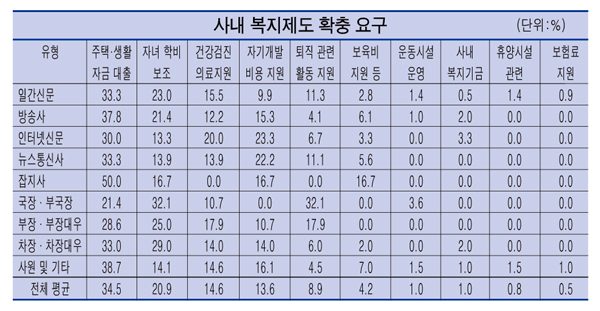 언론인 사내 복지 만족도 낮아언론인의 사내 복지 운영현황을 조사한 결과 건강검진 및 의료지원을 제공하는 비율이 83%로 가장 높게 나타났다. 이어 자녀학비보조(56.4%), 보험료 지원(50.4%), 휴양시설 이용 및 지원(46.7%), 사내복지기금(39.4%), 보육시설 이용 및 보육비 지원(29.0%), 운동시설 운영 및 이용(26.6%), 자기개발비 지원(18.8%), 퇴직대비 및 퇴직 후 활동지원(8.9%) 등이 뒤를 이었다.
