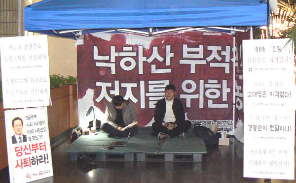 ▲ 전국언론노조 KBS본부가 여의도 KBS 신관 2층 로비에서 ‘낙하산 부적격 사장 저지를 위한 천막농성’에 돌입했다. (전국언론노조 KBS본부 제공) |