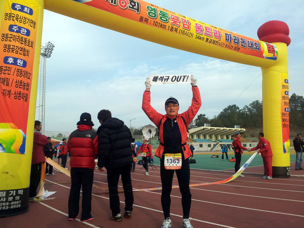 조승호 기자는 지난달 충북 영동군 육상경기연맹이 주최한 ‘영동곶감 울트라마라톤 대회’에 참가해 101km를 완주했다. 기록은 15시간44분41초. 오후 4시에 출발해 다음날 오전 7시44분에 테이프를 끊었다. 제한 시간 16시간 내에 골인한 조 기자는 참가자 540명 중 300등 안에 진입했다.