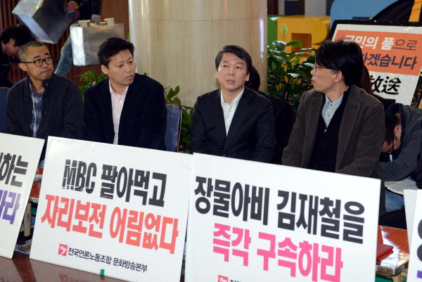 안 후보는 이날 오전 여의도 MBC 사옥 1층 로비에서 12일째 철야 농성중인 정영하 MBC 노조위원장 등 지도부를 만나 이 같이 밝혔다.