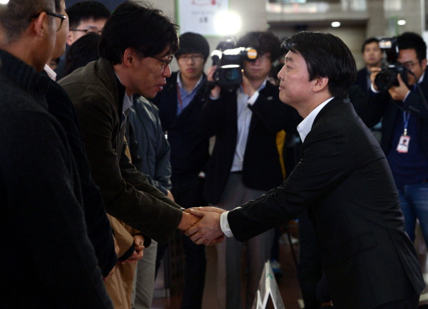 | ▲ 안철수 무소속 대통령 후보가 9일 서울 영등포구 여의도동 MBC를 방문해 정영하 MBC 노조위원장(왼쪽)과 악수를 하고 있다. (사진=뉴시스) | ||