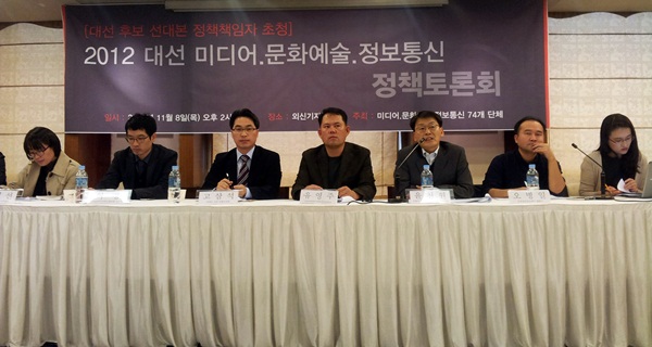 미디어ㆍ문화예술ㆍ정보통신 74개 단체는 8일 서울 중구 한국프레스센터 18층 외신기자클럽에서 대선 후보 선대본 정책책임자를 초청해 ‘2012 대선 미디어ㆍ문화예술ㆍ정보통신 정책토론회’를 열었다. 이날 박근혜 새누리당 대선 후보 선본은 토론회에 불참해 두 선본만 참석한 채 토론회가 진행됐다.