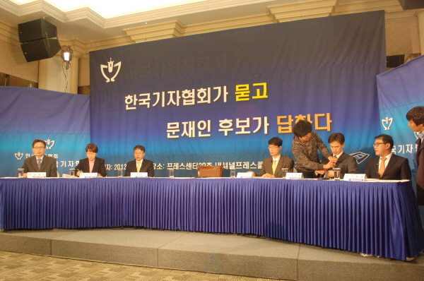 이날은 첫 번째 순서로 문재인 민주통합당 대선후보를 초청해 '한국기자협회가 묻고 문재인 후보가 답하다'라는 이름으로 토론회를 벌인다. 문 후보는 10시 25분 행사장에 도착했다.