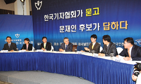 문재인 = 언론노조를 비롯한 언론 3단체와 사이에 언론자유에 관한 협약 체결했다. 언론자유를 완벽 보장하고 언론에 정치가 개입해서 언론의 정치적 중립성 해치는 일 결코 없을 것이라고 약속했다. 방통심의위가 방송 프로그램까지도 정치적 목적으로 개입해서 중립성을 해치는 건 말할 것도 없고 인터넷까지 심하게 규제하고 있다. 참여정부 때는 프리덤하우스가 우리를 인터넷자유국가로 분류했다. 지금은 인터넷부분자유국가로 강등된 상태다. 참여정부 때는 인터넷 국제경쟁력 2~3위였지만 점점 추락해서 작년 20위 밖으로 밀려났다. 인터넷이 하드웨어 망을 넘어서 인터넷의 콘텐츠, 소프트웨어까지 발전해야 한다. 이명박 정부의 인터넷에 대한 여러 규제가 인터넷의 건강한 영향력을 해쳤다. 저는 완벽한 인터넷 자유 국가를 만들겠다.