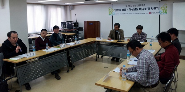 | ▲ 22일 서울 중구 경향신문 12층 회의실에서 열린 언론노조 주최 대선보도 토론회에서 참석자들이 발표자의 발언에 귀기울이고 있다,. | ||
