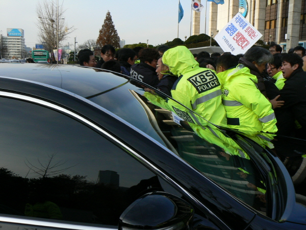 | ▲ 길환영 KBS 사장이 탄 차가 26일 서울 여의도 KBS 본관 앞에서 청원경찰들의 경호 속에 출근저지에 나선 노조원들을 뚫고 지나가고 있다.(사진=전국언론노조 KBS본부) | ||