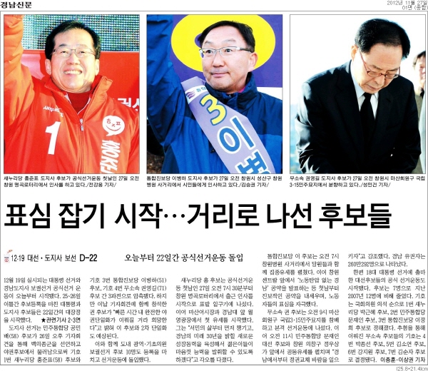 | ▲ 경남도지사 선거를 집중보도한 경남신문 27일자 1면. | ||