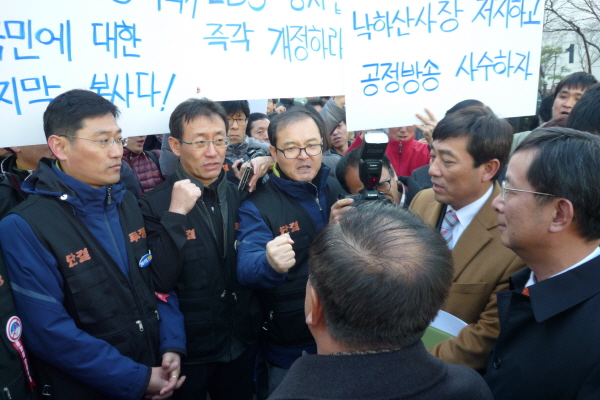노조원들이 “신용섭은 물러가라”라고 구호를 외치는 가운데 “돌아가라”는 류성우 지부장과 “들어가서 대화하자”는 신 사장을 수행하는 이명구 부사장 간의 실랑이가 이어졌다. 류 지부장은 신 사장을 향해 “EBS가 방통위의 인사적재를 해소하는 해우소냐”며 “공영방송 종사자로서 굴욕감을 느낀다”고 말했다. 그는 또 “2006년엔 사추위에 사원 대표가 참여했고, 2009년엔 사장 면접 과정을 인터넷으로 생중계했는데 이번엔 철저한 밀실 인사였다”며 “정당성을 확보하고 당당하게 들어오라”고 목소리를 높였다.