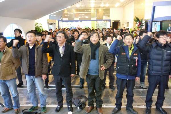 | ▲ EBS노조가 30일 오전 10시 서울 도곡동 본사 1층 로비에서 ‘임단협 승리 쟁취 및 낙하산 사장 저지’ 총파업 출정식을 가졌다. | ||
