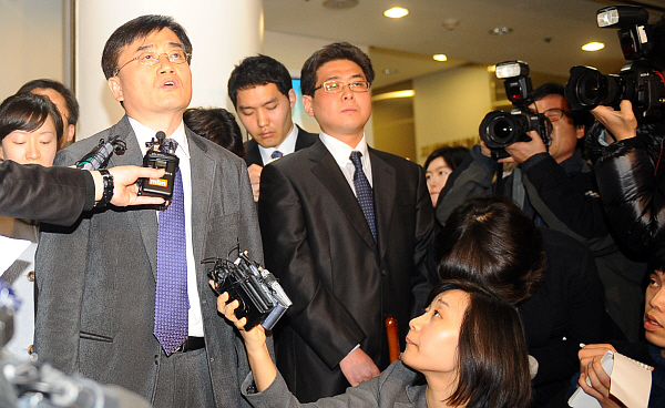 | ▲ 미국산 쇠고기 광우병 보도로 명예훼손 및 업무방해 혐의로 기소됐다가 무죄판결을 받은 조능희 MBC PD 등 PD수첩 제작진이 2010년 1월 서울중앙지법 앞에서 기자들의 질문에 답하고 있다.(뉴시스) | ||