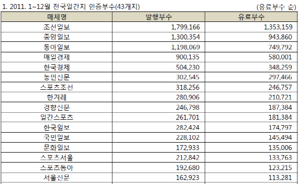 전국 일간지를 발행하는 51개 신문사 가운데 조선일보가 하루 평균 유료부수 135만3000부로 가장 많았으며 중앙일보(94만4000부), 동아일보(75만부)가 뒤를 이었다. 조선일보, 중앙일보, 동아일보는 발행부수에서도 각각 179만9000부, 130만부, 119만8000부로 1~3위에 올랐다. 2010년 유료부수와 비교해 조선, 중앙은 각각 약4만부가, 동아는 약11만부가 감소했다.