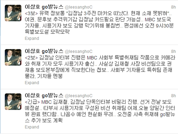 이상호 MBC 기자는 18일 새벽 자신의 트위터 계정을 통해 “MBC가 김정남 인터뷰를 비밀리 진행, 선거 전날 보도 예정설”이라는 글을 올렸다.