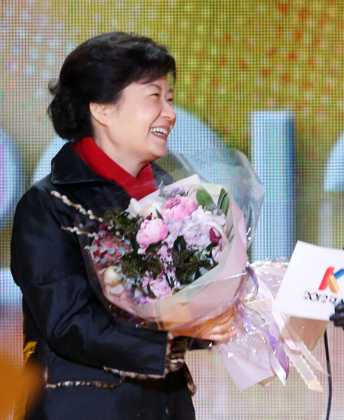 | ▲ 박근혜 대통령 당선인이 19일 밤 서울 광화문 광장에서 꽃다발을 받고 활짝 웃고 있다.(연합뉴스) | ||