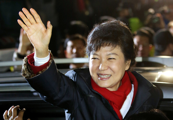 ▲ 박근혜 대통령 당선인이 19일 밤 서울 여의도 새누리당사를 방문해 지지자들에게 손을 흔들고 있다. (뉴시스) |