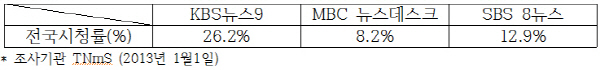 1일 저녁 메인뉴스 시청률(TNmS기준)은 KBS가 26.2%, SBS가 12.9%, MBC가 8.2%를 기록했다.