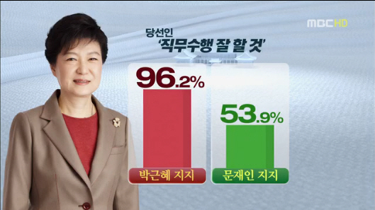 MBC는 국민의 78.3%가 박근혜 정부가 직무수행을 잘할 것이라고 내다봤다고 전망했다. MBC는 한국갤럽에 의뢰해 지난달 29일 전국의 만 19세 이상 성인 남녀 1052명을 대상으로 휴대전화와 집전화를 통해 설문조사 한 결과를 발표했다. 지난 대선에서 박 후보를 선택한 국민 중 96%가 또 문재인 후보를 선택했던 국민 가운데 53.9%도 박 후보의 직무수행을 잘 할 것이라고 내다봤다.