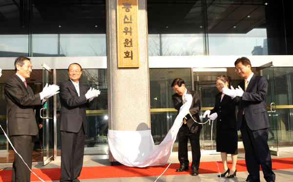 ▲ 2008년 3월26일 방송통신위원장 취임식이 열린 광화문 방송통신위원회 현관에서 최시중 당시 위원장(왼쪽 두번째)과 위원들이 현판식 후 박수를 치고 있다. ICT 전담부처 설립 논의가 활발해지면서 방통위가 출범 5년만에 어떻게 개편될 지 관심사다. (뉴시스) |