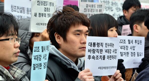 | ▲ 14일 서울 삼청동 대통령직인수위원회에서 앞에서 4대강조사위원회와 4대강복원범국민대책위원회 회원들이 대통령직인수위원회에 4대강사업 평가를 요청하는 기자회견을 갖고 있다.(뉴시스) | ||
