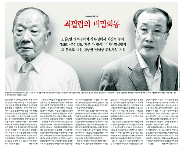 | ▲ 한겨레 최성진 기자가 최필립 정수장학회 이사장과 이진숙 MBC 기획홍보본부장의 밀실합의를 최초 보도한 2012년 10월13일자 한겨레 신문. | ||