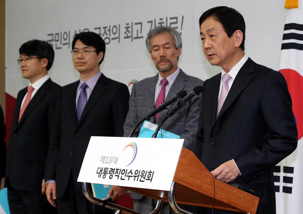 ▲ 대통령직인수위원회 진영 부위원장이 22일 오후 4시 서울 종로구 삼청동 금융연수원 공동기자회견장에서 정부조직개편안의 후속조치를 발표하고 있다. (뉴시스) |