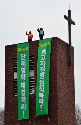 | ▲ 6일 오후 서울 종로구 혜화동성당 맞은편 종탑에서 전국학습지산업노동조합 재능지부 노동자들이 단체협약 원상회복과 해고자전원복직을 위한 고공농성을 펼치고 있다.(뉴시스) | ||