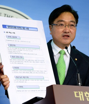 | ▲ 우원식 민주통합당 원내수석부대표를 비롯한 행정안전위원회 소속 의원들이 13일 서울 여의도 국회 정론관에서 행안위 안건조정위원회에서 정부조직 개편안 논의를 촉구하는 기자회견을 진행하고 있다. (뉴시스) | ||