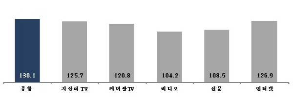 매체별 KAI는 인터넷이 126.9로 가장 높았고 지상파TV 125.7, 케이블TV 120.8, 신문 108.5, 라디오 104.2 등의 순으로 나타났다.