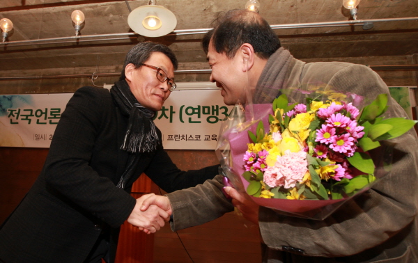▲ 20일 서울 정동 프란치스코 교육회관에서 열린 전국언론노조 대의원회에서 선출된 강성남 제7대 언론노조 위원장과 이강택 제6대 위원장이 악수를 나누고 있다.(사진=언론노조) |