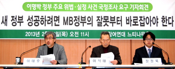 참여연대는 “이명박 정부의 위법·실정사건의 진상규명과 관련자들에 대한 책임추궁이 이뤄지지 않는다면 정부의 권력남용과 위법행위가 반복될 것”이라며 “곧 출범할 박근혜 정부가 성공하기 위해서라도 이명박 정부를 반면교사 삼을 수 있도록 국회가 위법과 실정의 진상을 규명하고 재발방지대책을 내놓아야 한다”고 했다.