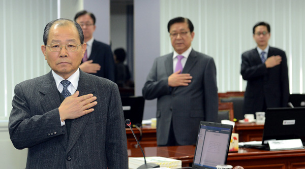 ▲ 이계철 방송통신위원장이 지난 20일 오전 서울 세종로 방송통신위원회에서 열린 전체회의에 참석, 국민의례를 하고 있다. (뉴시스) |