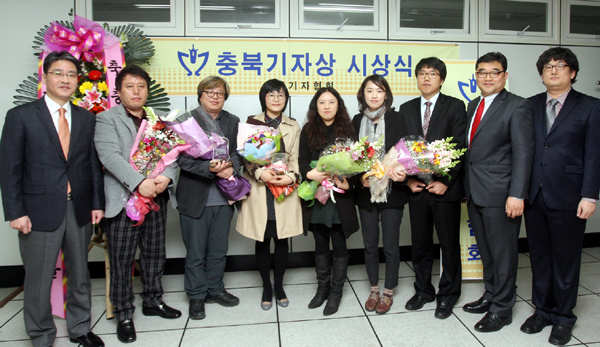 ▲ 지난달 27일 충북기자협회 주최로 열린 ‘2012 충북기자상 시상식’에서 박종률 한국기자협회장(맨 왼쪽)과 유승훈 충북기자협회장(오른쪽에서 두번째) 및 수상자들이 기념촬영을 하고 있다. (충북기협 제공) |