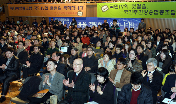 ▲ 지난 3일 서울시청 신청사 다목적홀에서 열린 ‘미디어협동조합 국민TV 기념식 및 창립총회’에서 발기인 및 설립동의자들이 발대식을 지켜보고 있다. (뉴시스) |