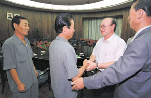사진설명:지난 19일 밤 해방이후 남북 기자단체간 첫 공식회담이 열린 평양고려호텔에서 한국기자협회 정일용 감사와 북조선기자동맹 김상호 부위원장이 반갑게 악수를 나누고 있다. 사진제공=시민의신문