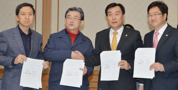| ▲ 여야 원내대표 및 원내수석부대표가 17일 오후 서울 여의도 국회 귀빈식당에서 정부조직법 개정안에 합의했다. 왼쪽부터 김기현 새누리당 원내수석부대표, 이한구 새누리당 원내대표, 박기춘 민주통합당 원내대표, 우원식 민주통합당 원내수석부대표가 합의문을 보이고 있다. (뉴시스) | ||