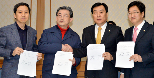 ▲ 여야가 지난 17일 여의도 국회 귀빈식당에서 양당 원내대표 및 원내수석부대표가 참여하는 ‘4인 회동’을 열고 정부조직법 개정안에 합의했다. 왼쪽부터 김기현 새누리당 원내수석부대표, 이한구 새누리당 원내대표, 박기춘 민주통합당 원내대표, 우원식 민주통합당 원내수석부대표가 합의문을 보이고 있다. (뉴시스) |