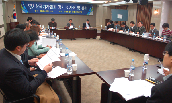 한국기자협회(회장 박종률)는 지난 15일 서울 중구 한국프레스센터 19층 기자회견장에서 ‘2013 제1차 정기 이사회 및 총회’를 열고 신규 가입사 6곳을 승인했다. 새로 가입된 회원사는 뉴스Y, 뉴스1, 뉴시스경기남부ㆍ인천, 채널A, TV조선, tbs다. 이어 2012년 결산 및 2013년 예산이 의결됐고, 올해 시행할 주요 업무가 보고됐다.