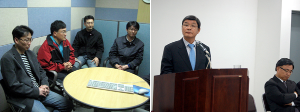 ▲ 4년이라는 세월을 사이에 둔 3월22일의 두 모습. 2009년 긴급체포된 뒤 남대문 경찰서에서 노조 집행부와 면담을 하고 있는 임장혁, 조승호, 현덕수, 노종면 기자(왼쪽 사진). 2013년 서울타워에서 열린 주주총회에서 주주의 질의를 듣고 있는 배석규 사장(왼쪽)과 김백 상무. |