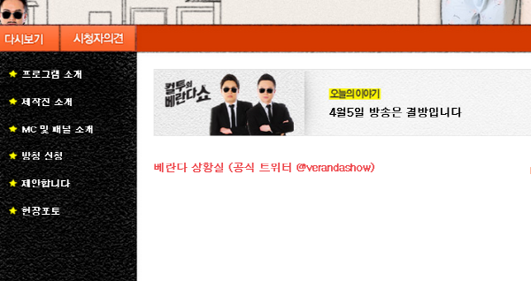 | ▲ MBC 시사교양프로그램 ‘컬투의 베란다쇼’가 5일 홈페이지를 통해 결방을 알렸다. (홈페이지 화면캡처) | ||