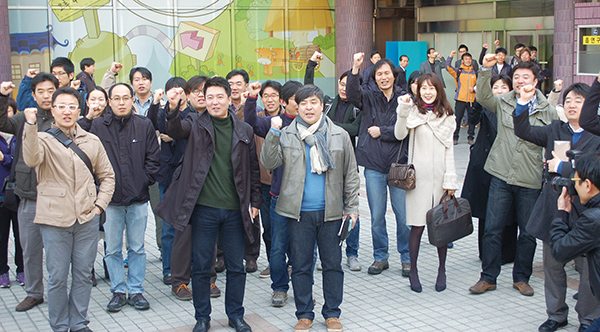 ▲ 전국언론노조 MBC본부는 복귀자 54명을 환영하는 자리를 마련했다. 9일 오전 8시30분 서울 여의도 MBC 사옥 남문광장에서 돌아온 이들이 출근에 앞서 ‘파이팅’을 외치고 있다. |