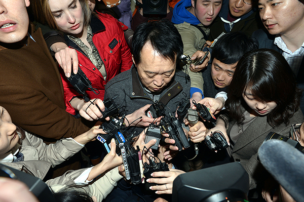 ▲ 북한이 개성공단 가동을 잠정 중단하겠다고 발표한 가운데 9일 오전 경기도 파주 문산읍 남북출입사무소에서 개성공단 관계자가 입경한 뒤 취재진에게 질문을 받고 있다. (뉴시스) |