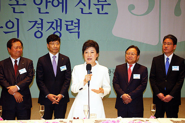 또 박 대통령은 “오늘 우리 신문이 21세기 지식산업의 견인차 역할을 잘 해낼 수 있다”며 “창의형 인재를 길러내고 통섭과 융합의 꽃을 피워내려면 지식과 콘텐츠의 보고인 신문의 역할이 대단히 중요하다”고 밝혔다.