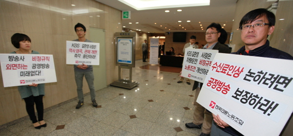 ▲ 심포지엄이 열린 기자회견장 앞에서 언론노조가 KBS의 현대사 다큐 신설 논란과 비정규 차량노동자들에 대한 처우 문제 등에 반발하며 피켓 시위를 벌였다. (사진=언론노조) |