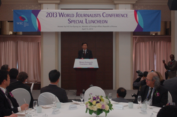 윤 장관은 이날 서울 중구 프레스센터에서 ‘박근혜 정부의 외교정책’이란 주제로 특강을 하며 이 같은 메시지를 전달했다. 특강은 한국기자협회(회장 박종률)가 주최하는 ‘세계기자대회(World Journalist Conference)’의 한 일정으로 마련됐다.