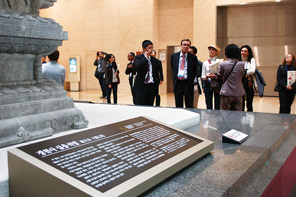▲ 세계기자들이 국립중앙박물관에 전시 중인 국보 86호 경천사 10층 석탑에 대한 유래와 설명을 큐레이터로부터 듣고 있다. |