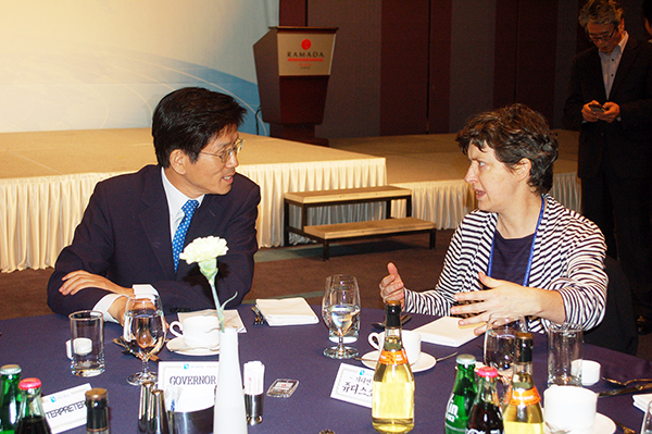 ▲ 17일 경기 수원시 팔달구 라마다플라자에서 열린 오찬에서 김문수 경기도지사와 영국 가디언지의 주디스 솔 부편집장이 대화를 나누고 있다. (양성희 기자) |