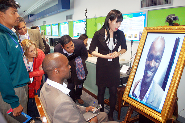 ▲ 르완다 ‘뉴 타임스’의 진 데 라 크로익스 타바로 기자가 17일 대전 유성구 한국전자통신연구원에서 디지털 초상화 시스템을 체험하고 있다. (강진아 기자) |